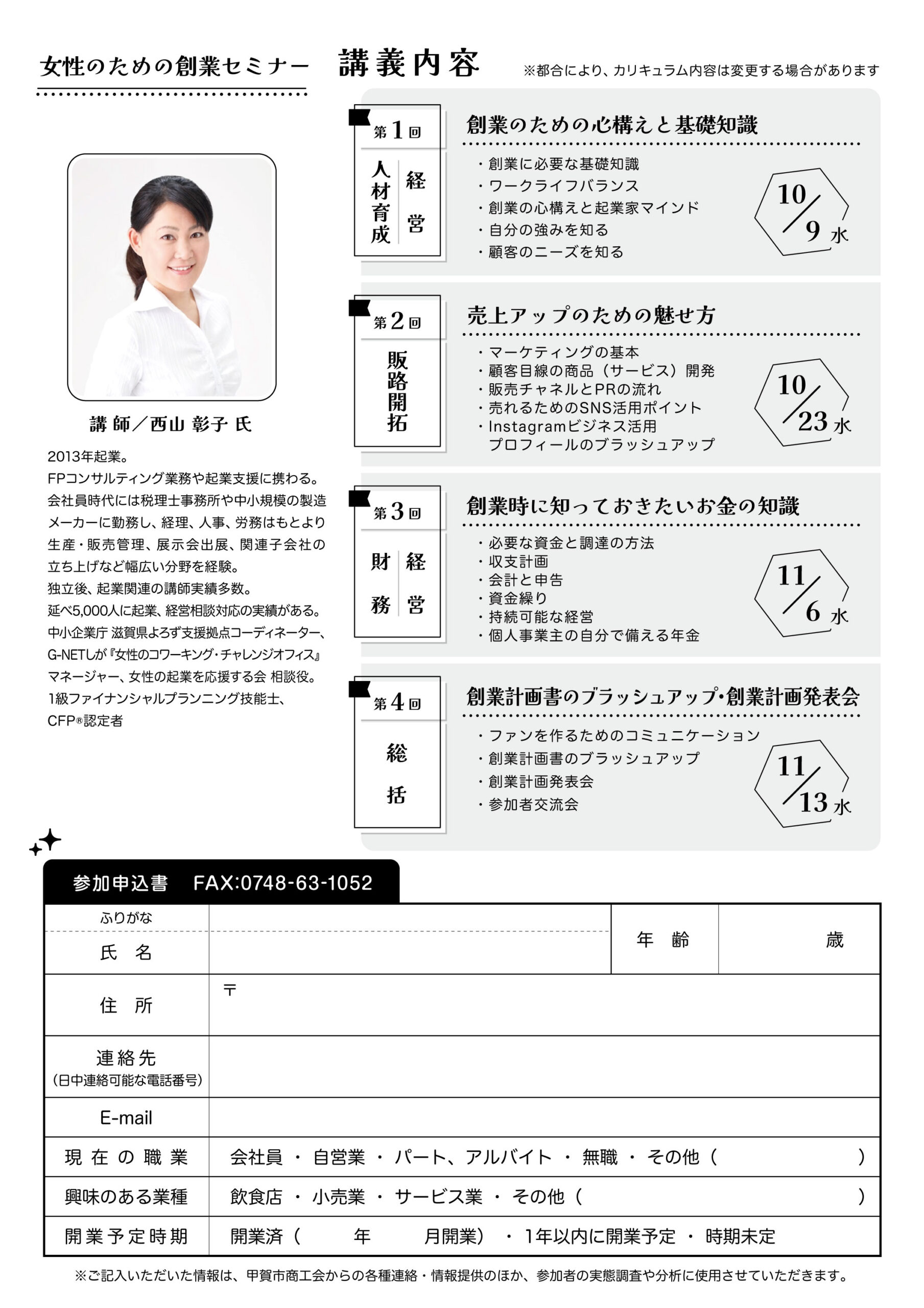 参加対象:甲賀市内で創業を目指す女性、創業後間もない女性
