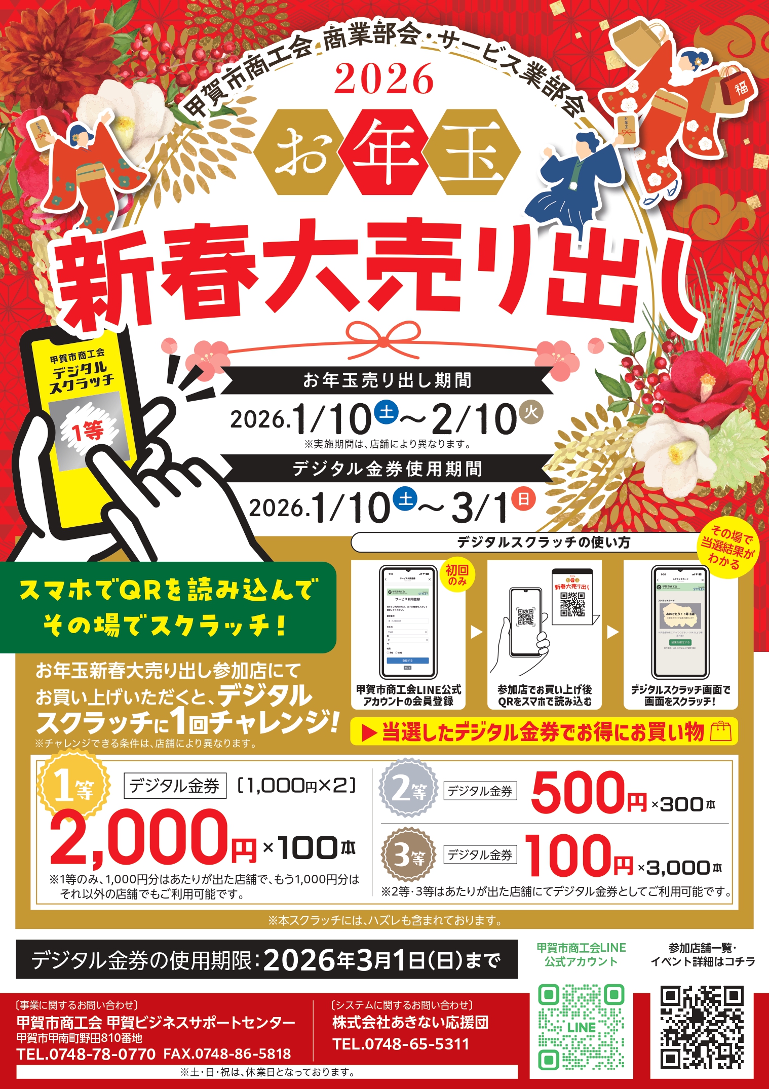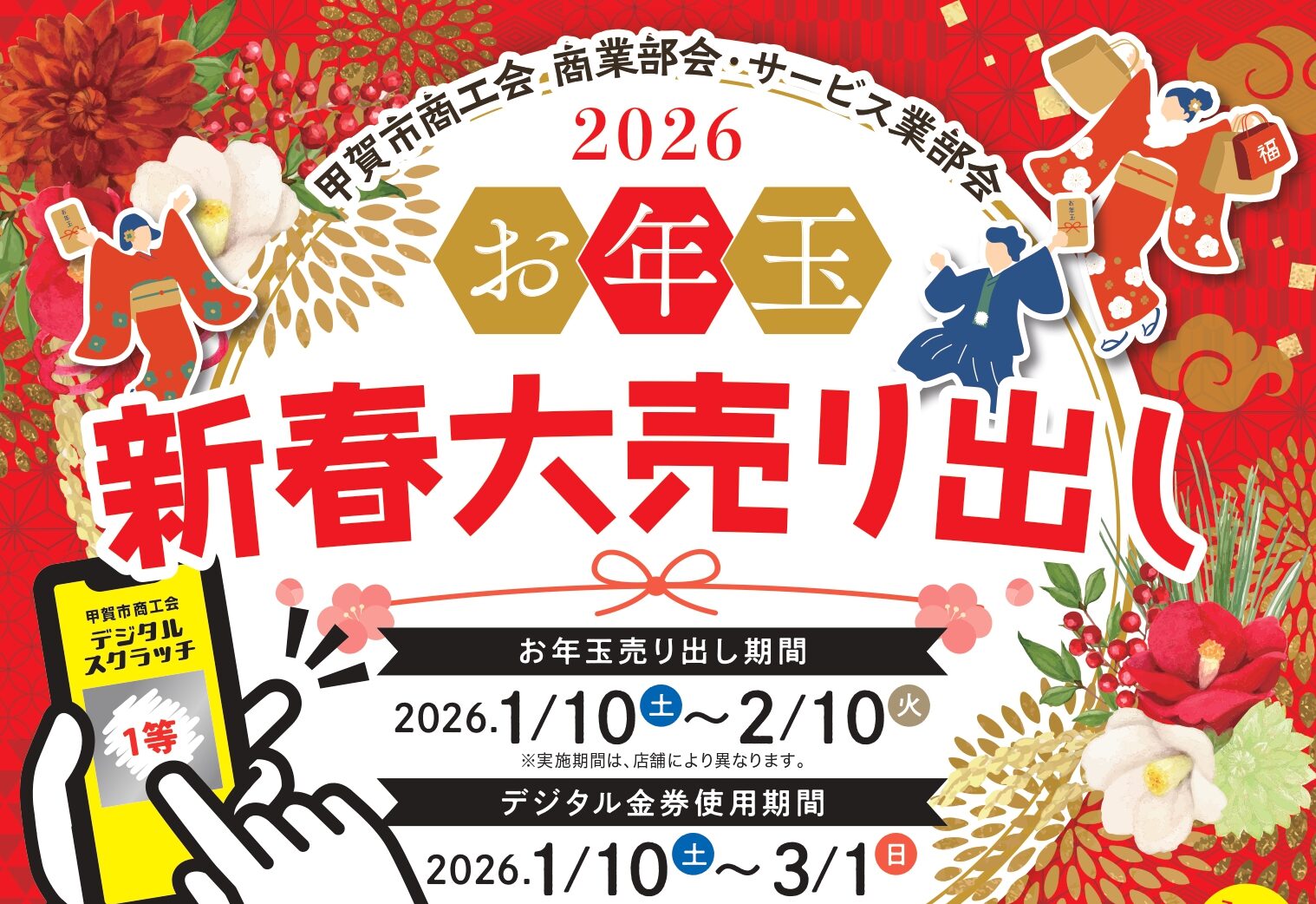 お年玉売り出し期間に、参加店舗でお買い物いただくと、デジタルスクラッチに1回チャレンジできます。